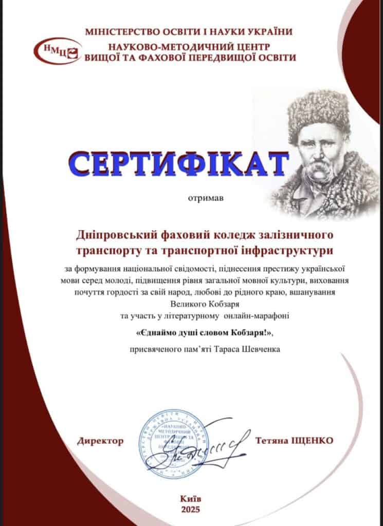 Колектив Дніпровського фахового коледжу залізничного транспорту та транспортної інфраструктури разом зі здобувачами освіти взяли участь у літературному онлайн-марафоні, присвяченому пам’яті Тараса Шевченка «Єднаймо душі словом Кобзаря!»